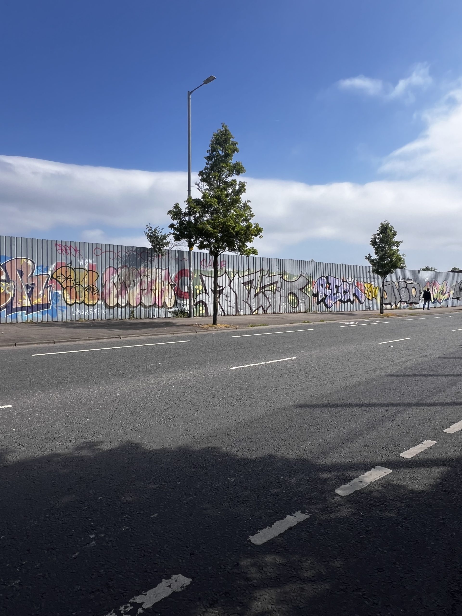 Dat merk ik ook als we doorrijden naar de Peace Wall, een hoge lange muur die de katholieke en protestantse gemeenschappen scheidt. De muur, bedekt met kleurrijke graffiti en boodschappen van hoop, is een opvallend symbool van de stad. De omgeving is somber, met lege straten en huizen die bijna tegen de muur lijken te leunen, wat een enigszins deprimerende sfeer creëert.