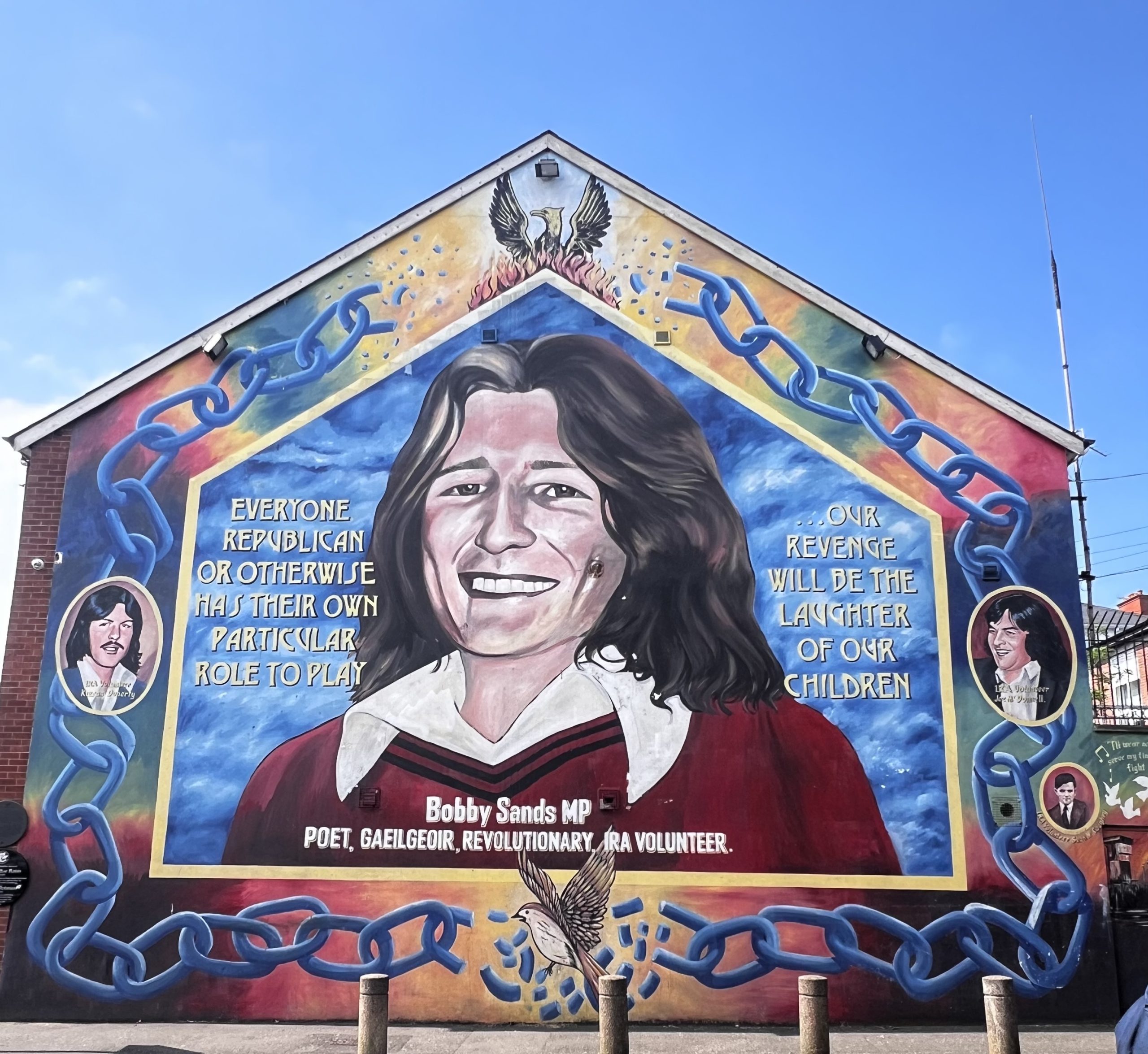Vervolgens gaan we verder naar de beroemde Falls Road, een katholieke wijk die bekend staat om zijn politieke muurschilderingen. Een van de meest opvallende is de Bobby Sands mural, een eerbetoon aan de IRA-hongerstaker. De schildering is krachtig en vol emotie. In een winkel met aandenkens aan de Troubles zie ik een mooi gedicht hangen, gemaakt door Bobby Sands.
