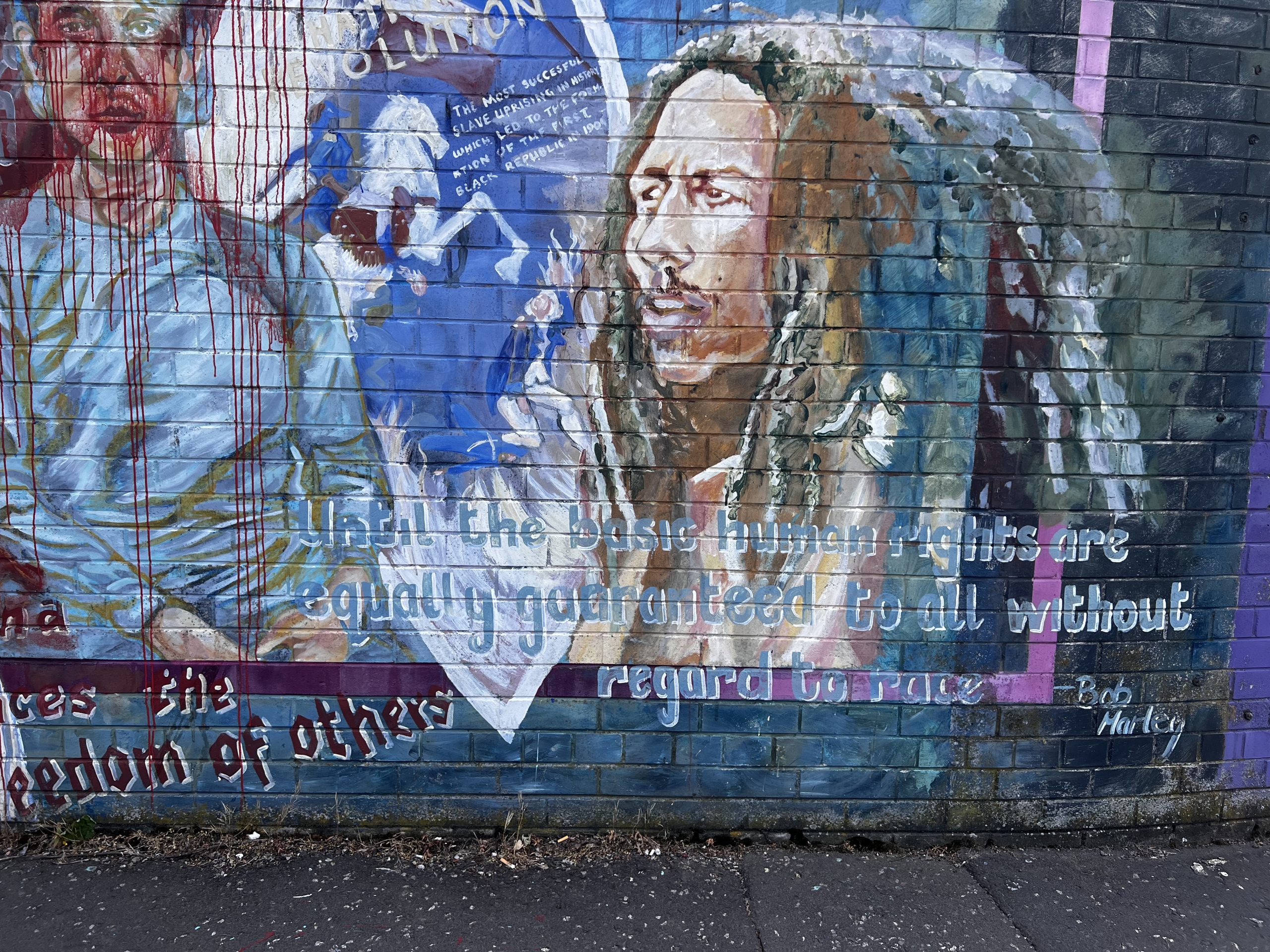 In Falls road zie je verschillende ook muurschilderingen die verbinding en solidariteit tonen met verschillende internationale vrijheids- en rechtvaardigheidsbewegingen.